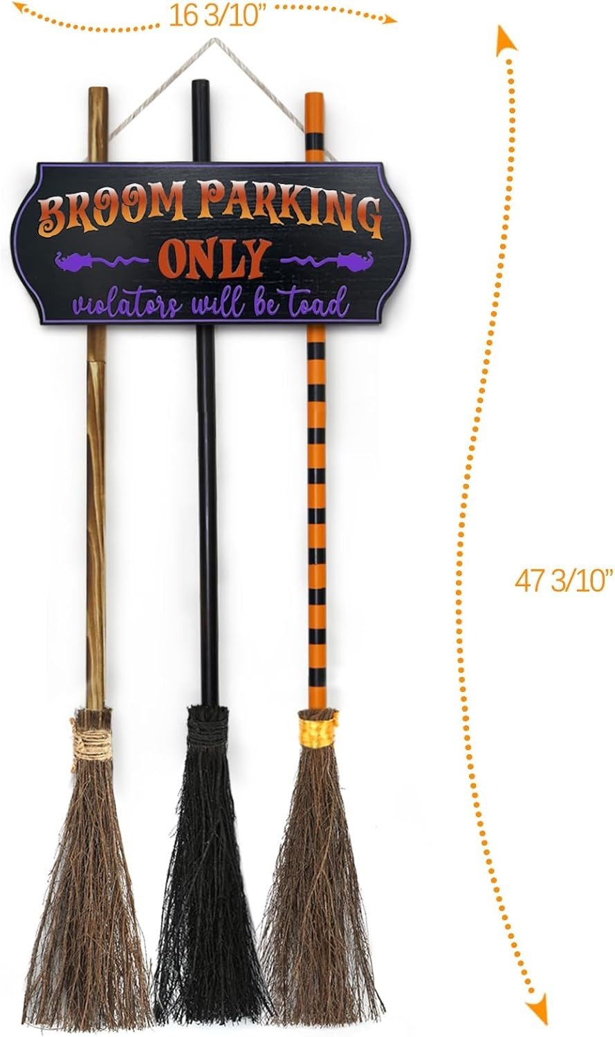 Broom Parking Sign with 3 Wooden Witch Brooms – Cute Halloween Porch Decor for Indoor & Outdoor Parties