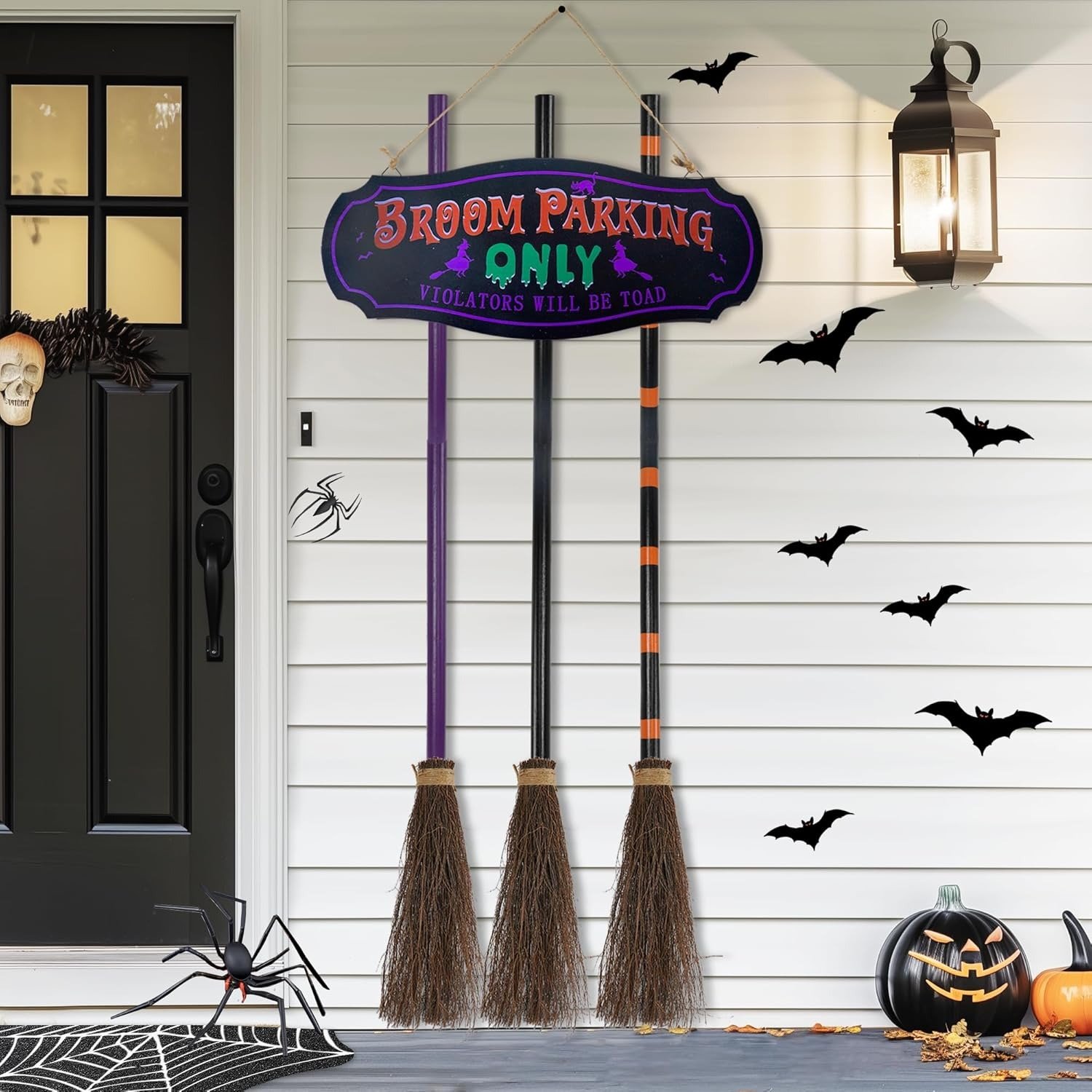 Enchanting Halloween Broom Parking Sign with 3 Wooden Witch Brooms – Whimsical Porch & Party Decor