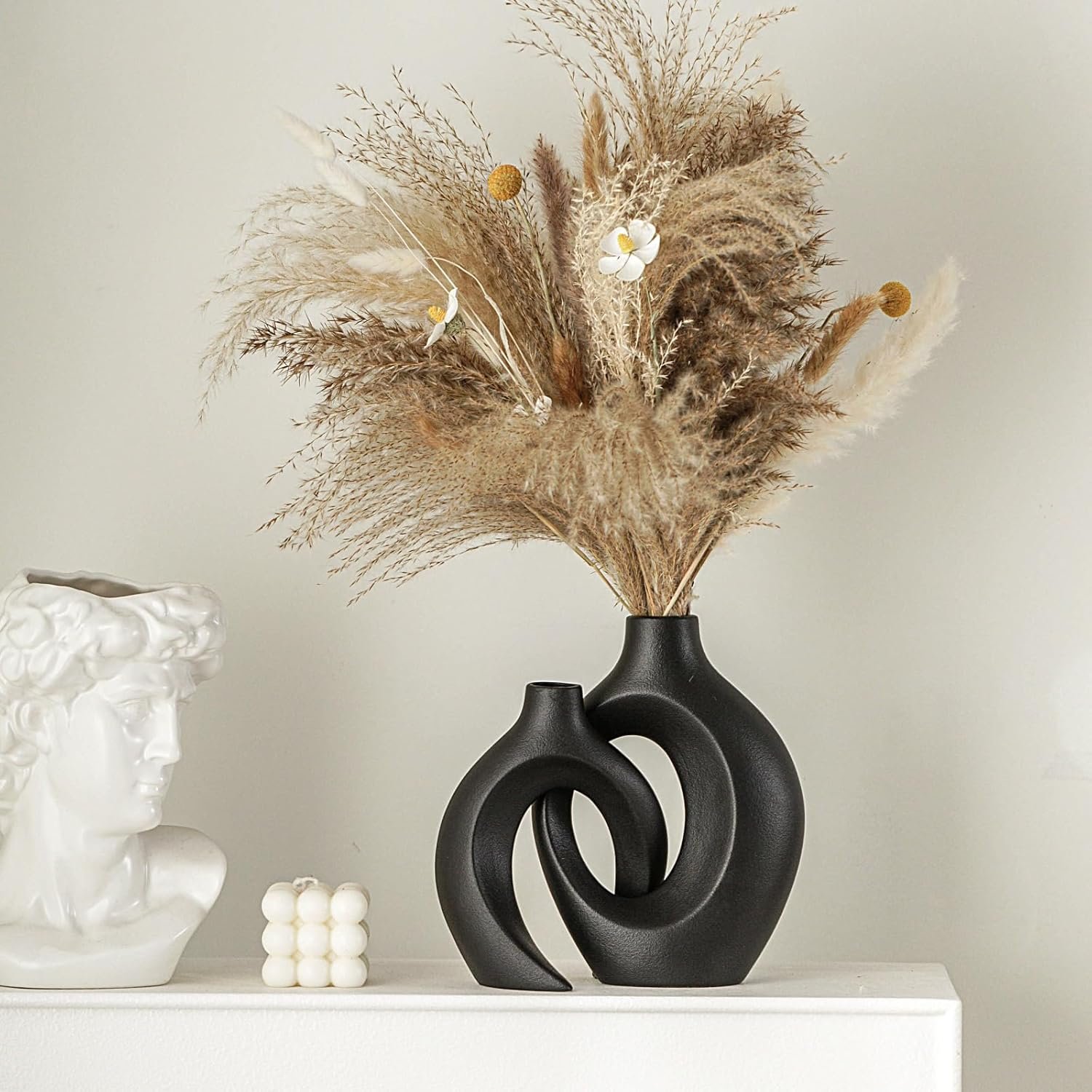 Elevate your home decor with the Levvohd Black Hollow Ceramic Vase Set of 2, a stunning Nordic minimalist centerpiece crafted by the Levvohd brand. These handmade matte off-black vases feature a unique cuddling couple design, making each set truly one-of-a-kind. Perfect for displaying dried flowers or greenery, their modern geometric appeal suits any room or event. Built with durable ceramic and thoughtful stability, this set also makes an elegant gift—all backed by Levvohd’s responsive customer service.