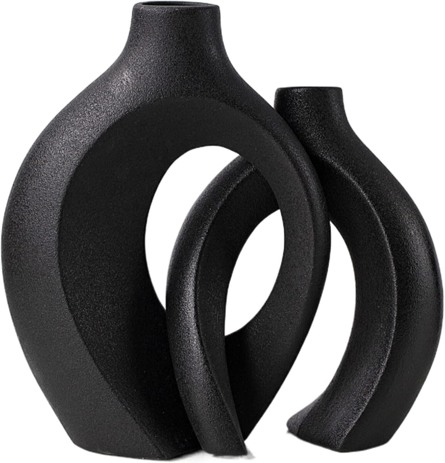 - Donut Vase Set: This hollow modern vase ensemble includes two sizes (8″ and 7″ tall), expertly finished in matte off-black, a trending shade for black home decor lovers.
